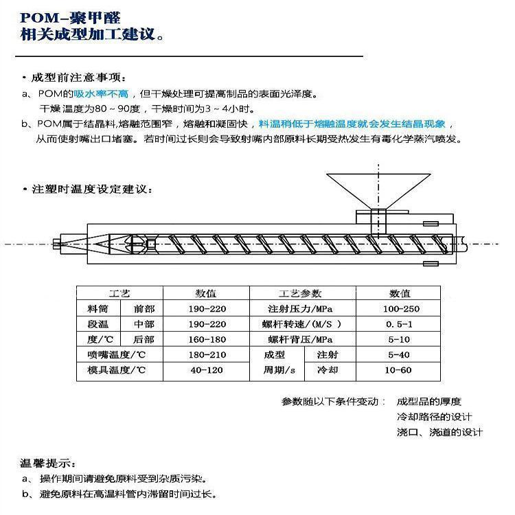 6.POM原料吸水率大于0.2%,成型前应预干燥,POM熔融温度与分解温度相近,成型性较差,可进行注塑、挤出、吹塑、滚塑、焊接、粘接、涂膜、印刷、电镀、机加工、注塑是重要的加工方法,成型收缩率大,模具温度宜高些,或进行退火处理,或加入增强材料(如无碱玻璃纤维)。