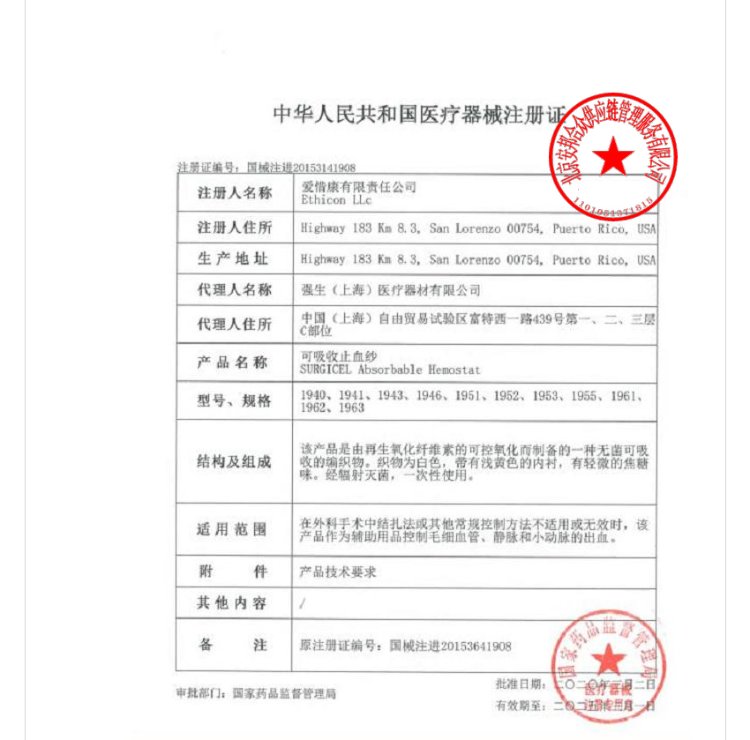 强生爱惜康公司生产的速即纱—可吸收止血纱布。