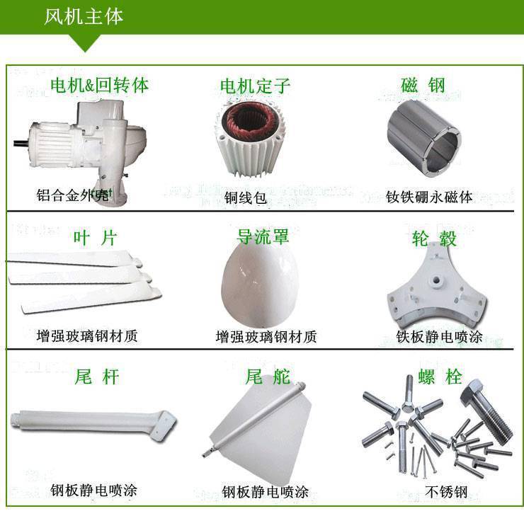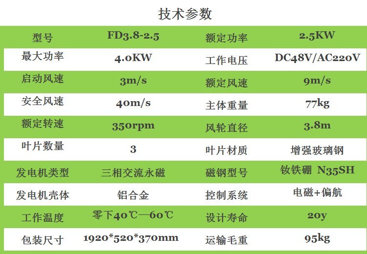 3.增强玻璃钢风轮叶片,配以优化的空气动力功外形设计和结构设计,启动风速,风能利用系统高,增加了年发电量。