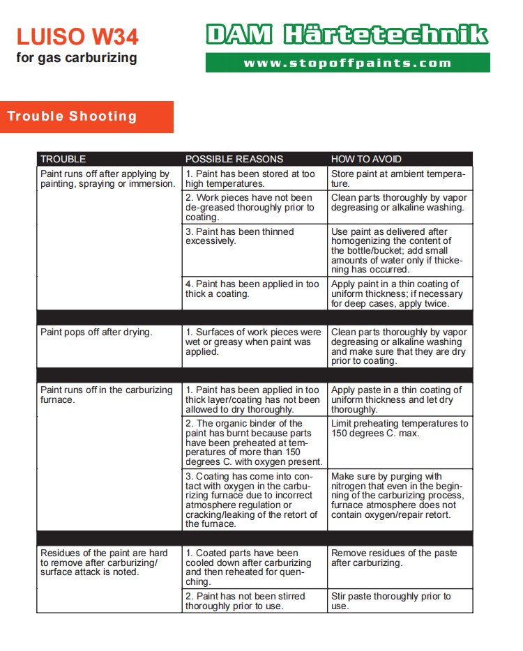 使用前,应将 LUISO W34 短暂搅拌,然后用油漆刷涂抹。一层就足够了。为避免蒸发,罐头在使用后应密封。为了恢复正常粘度,可以添加最多 2 的水来稀释停止涂料。不需要特殊的稀释剂。 LUISO W34 的干燥时间为 30 分钟。不需要的糊状残留物可以用水轻松去除。 LUISO W34 的热处理温度不应超过 1050 °C。热处理后,可以通过喷丸或钢刷去除 LUISO W34 残留物。