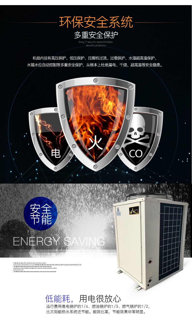 陇赣空气源热泵热水器用电量少,节能运行费用。机组可根据用户实际使用情况,实现定时、定温、定水位功能,错开用电高峰期,减少运行费用。空气源热泵热水器适应能力强,外界水压不稳或断电时,自动调整系统运行状态,安全可靠。名优零部件,延长了机组使用寿命,一次投资长久享用。