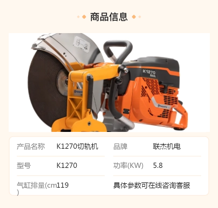 联杰机电 K1270切轨机 350/355mm刀片 性能强大 切割精度高 速度快 产品 | K1270切轨机 | ||