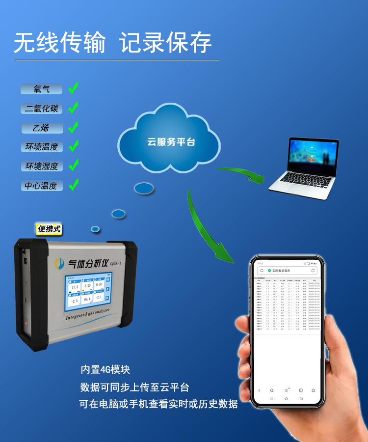 检测项目 | 氧气/二氧化碳/乙烯/环境温湿度/中心温度 | ||