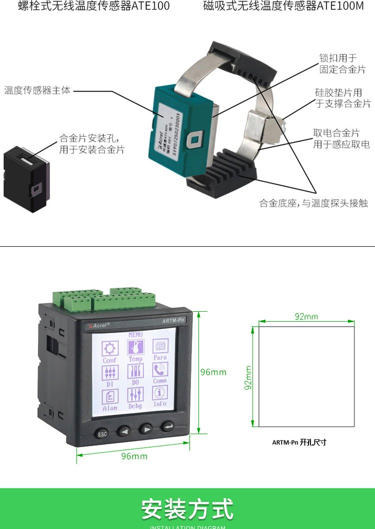 应用范围 | 断路器触头、电缆搭接头 母排测温 | ||
