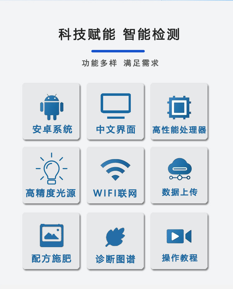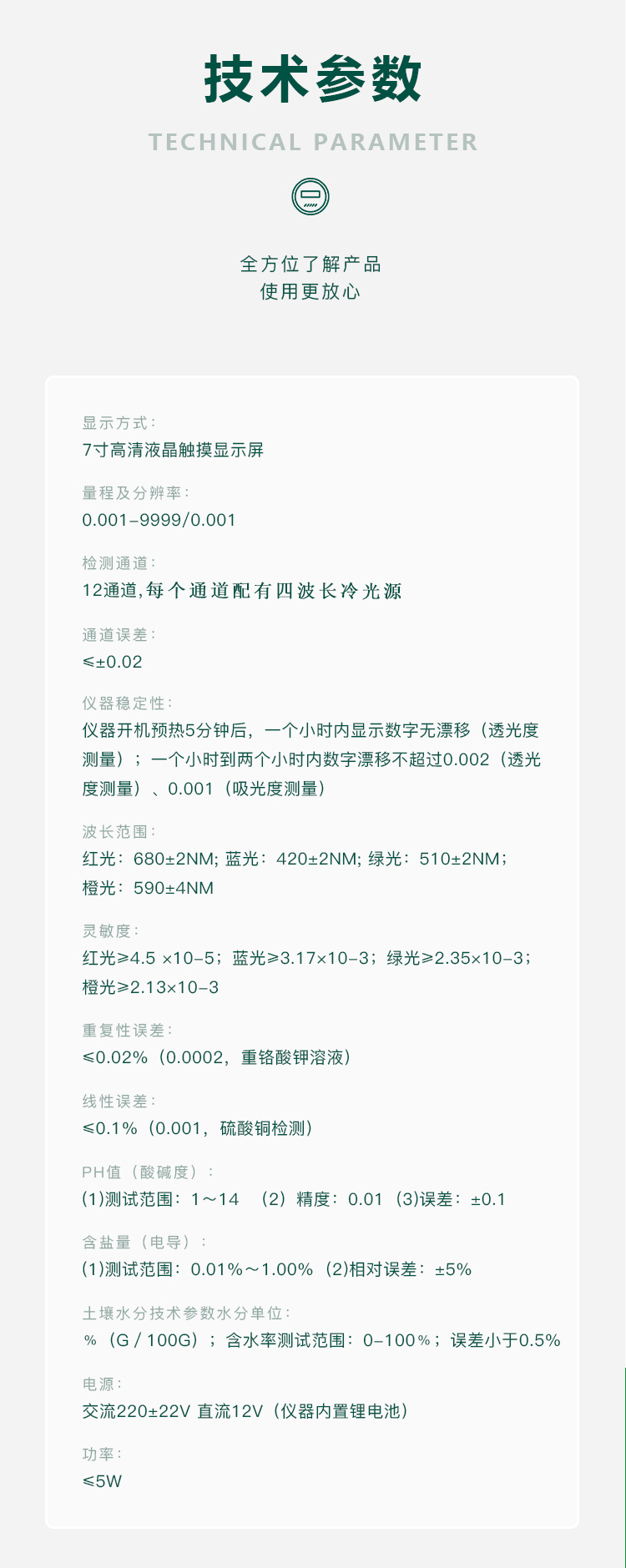 波长范围 | 红光620±8nm 蓝光440±8nm; 8.土壤中速效N、P、K三种养分一次性同时浸提测定、科学推荐施肥量 | ||