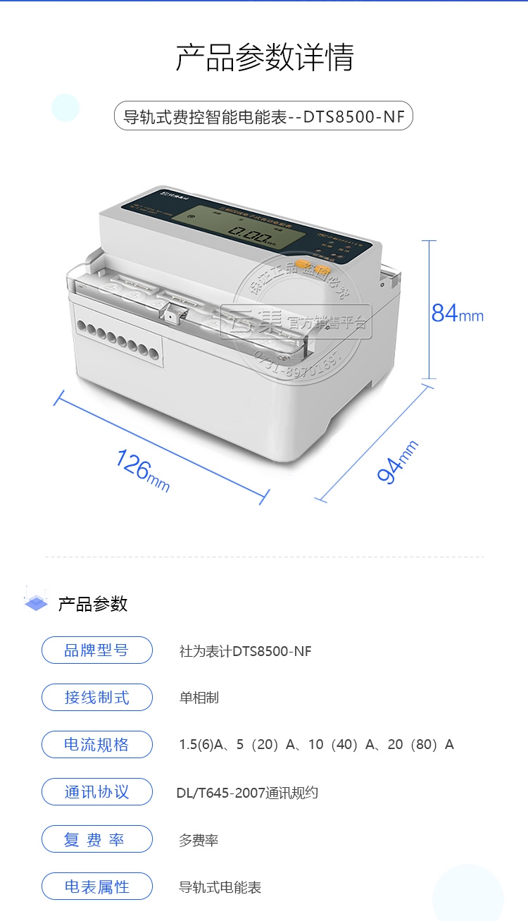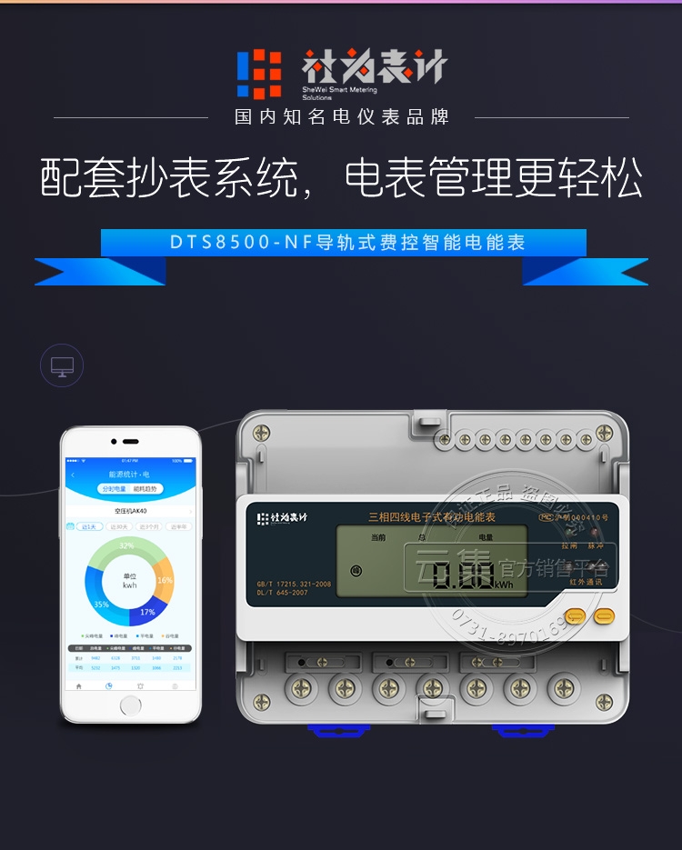 社为表计DTS8500-NF三相四线电子式有功电表是社为表计研发生产的高端电表,社为表计三相四线电表具有质量好、安全稳定、读数精准、寿命长等特点,功能具有:计量正反向有无功电量、分时付费率、防窃电等,可配套远程抄表系统,能耗监测系统。