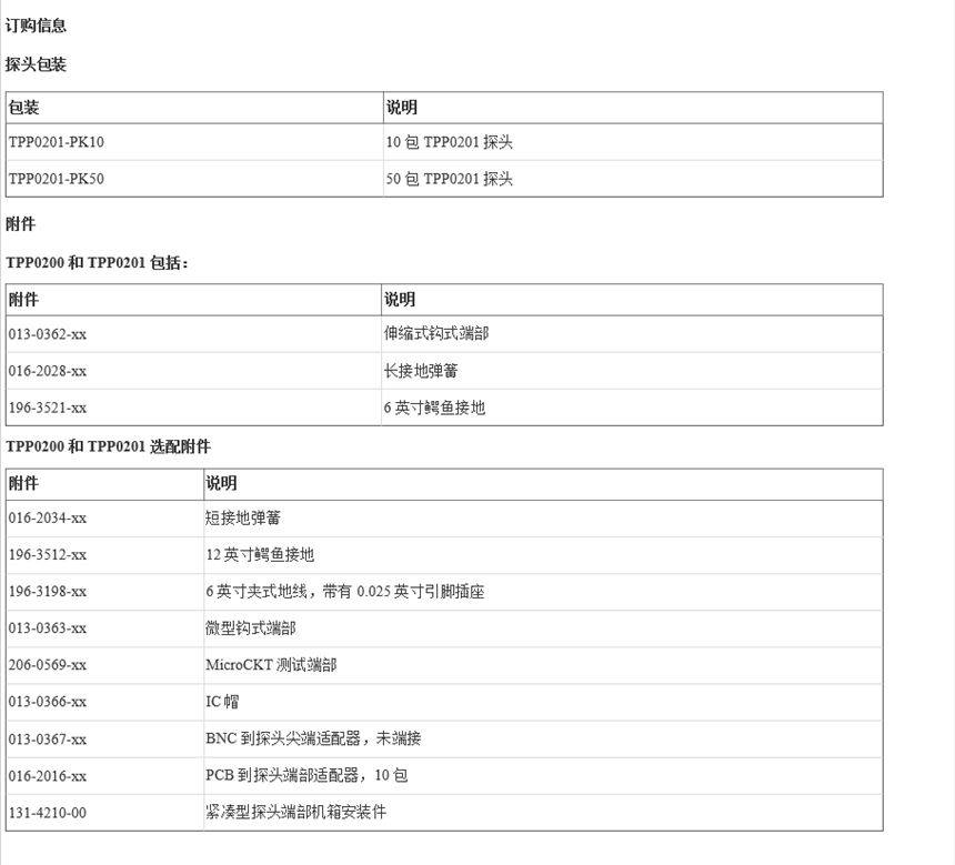 TPP0200 和 TPP0201 探头是输入电阻为 10 M? 的 200 MHz、10X 无源电压探头。这些探头用于带有 1 MΩ/13 pF (TPP0200) 和 1 MΩ/20 pF (TPP0201) 输入的 BNC 示波器。