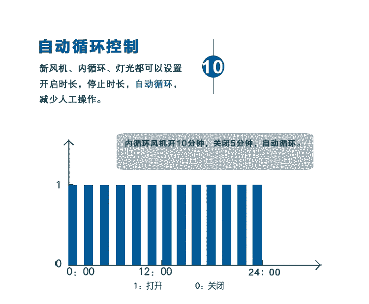 控制仪采用先进的数字传感技术、微电脑技术、自动化控制技术,液晶大屏显示,进口处理器,采集数据稳定快速。该系统实时监测并显示环境中的温度、湿度、CO2浓度值,同时自动控制加温、降温、通风等设备,使环境中的温度、湿度、CO2浓度始终维持在最适宜的状态,循环灯光控制,有利于作物的生长,当环境异常,及时启动报警系统,实现生长环境的精准控制,提高种植或培育物的产量。