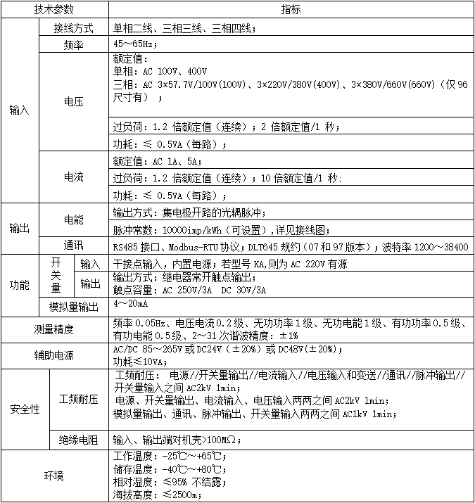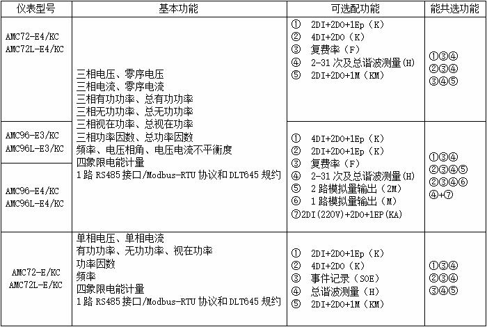 1、DI--开关量输入 DO--开关量输出 M--模拟量输出 SOE--事件记录 H--谐波测量 Ep--电能脉冲 96-96外形 72-72外形 L-液晶显示(空白是数码管) E3-三相三线电能 E4-三相四线电能 K-开关量输入/输出模块(I/O模块) C-RS485通讯 F-复费率(选配) KA-开关量有源DI输入/无源输出模块