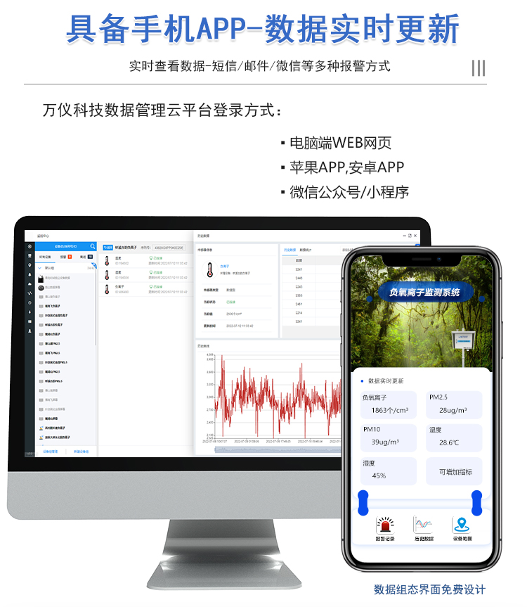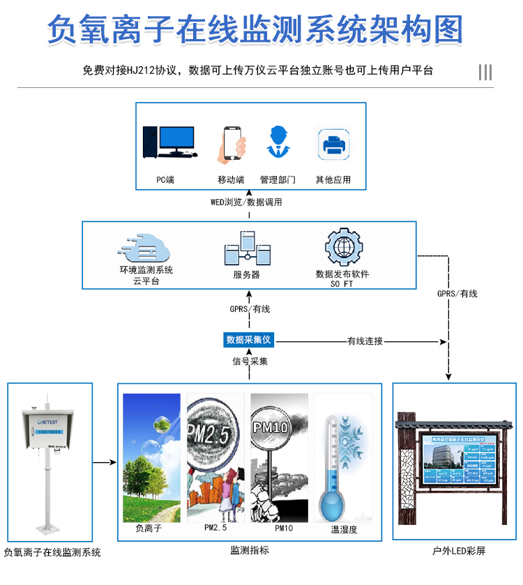通过无线方式实时和可设定间隔的采集负氧离子及各项指标的数据发送,可通过PC、Ipad、