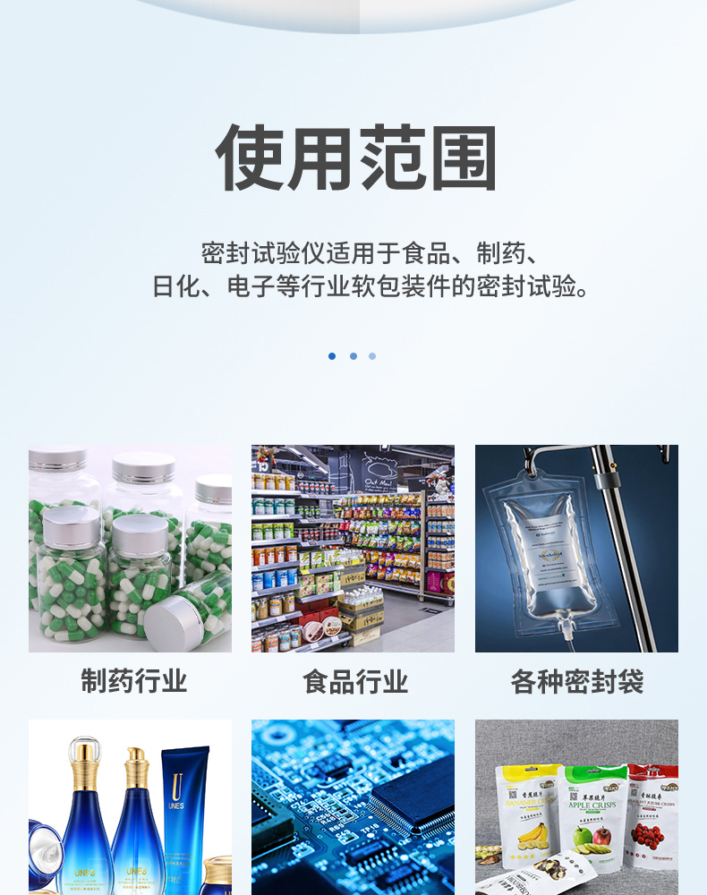 适用于食品、制药、日化、电子等行业软包装件的密封试验。通过试验可以有效地比较和评价软包装件的密封工艺及 密封性能,为确定相关的技术指标提供科学依据。亦可进行经跌落、耐压试验后的试件的密封性能测试