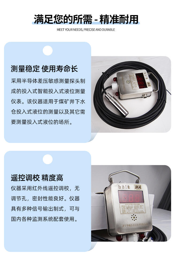 煤安认证井下矿用液位计 多种输出高低位报警济宁华瑞矿用投入式液位计是采用半导体差压敏感测量探头制成的投入式智能投入式液位测量仪表。该仪器适用于煤矿井下水仓投入式液位的测量以及其它需要测量投入式液位的场所。仪器采用红外线遥控调校,无调节孔,密封性能良好。