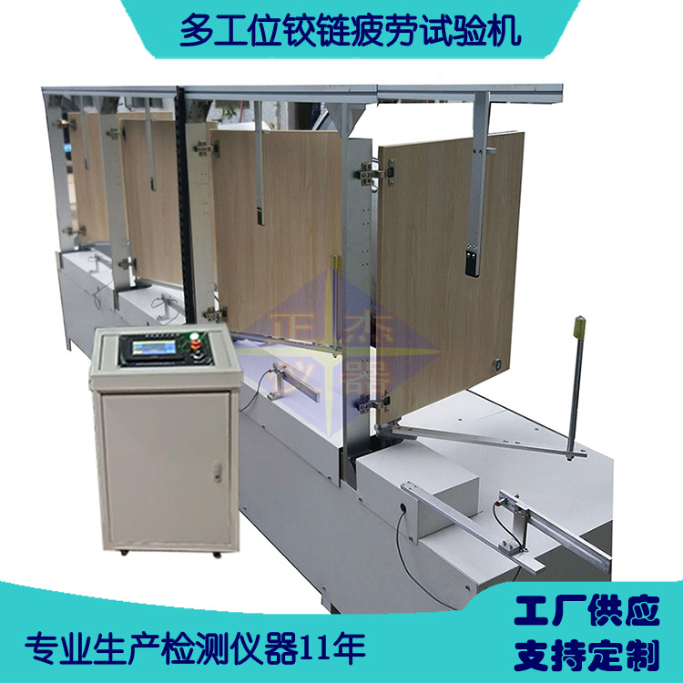 本试验机依据EN15570-2008、QB/T2189-2013等标准要求设计,用于测试柜门铰链的性能,测试结果可作为判断产品质量的依据。本机采用电动触摸屏控制,共四个工位,各工位可独立运行互不影响,可显示测试的次数、频率、角度、力值等,到达设定的次数可自动停机