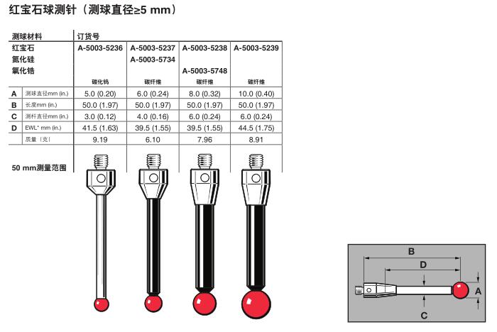 这是zui简单的一种测针,采用高球度的工业红宝石测球和备选的各种测杆材料。用很长的测针/加长杆组合进行测头测量时,建议不要选择标准的机械式触发测头,因为其刚性低,会因测针的弯曲造成精度损失。采用如应变片式传感技术等其他测头类型则不致于如此,因为其测力很小,可使用长测针/加长杆组合而不会产生明显的精度损失。