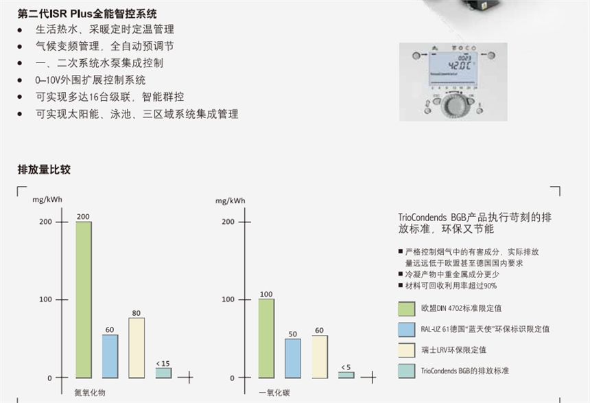 一级能效,全预混变频燃烧,热效率高达109%,运行费用更低。此外,该锅炉还配备了欧洲A级能效永磁变频泵(38kW以上选配),其所消耗的电量只有普通泵的50%。
