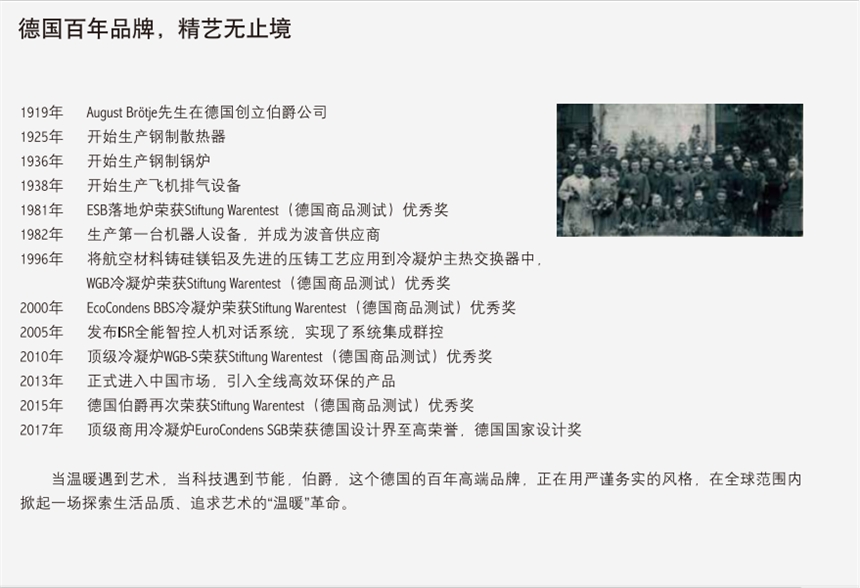 德国伯爵,以近百年创新基因,不断驱动供暖技术的革新。在伯爵发展的卓越历史中,凭借其在供暖技术领域的丰富经验,率先致力于生产低耗能和舒适型的产品,并先后开发了燃气、燃油、固体材料供暖系统和太阳能设备等诸多新技术和新产品。通过这些以未来热能为导向的产品,特别是燃烧值技术领域的研发产品,伯爵获得了持续发展的动力,稳固的站在了高端供暖技术的前沿。