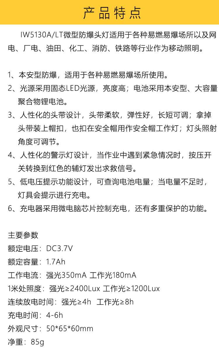 微型防爆头灯 IW5130A/LT 固态LED 安全帽头戴式 Exib ⅡCT3 IP65 是否支持360°旋转 | 否 | ||