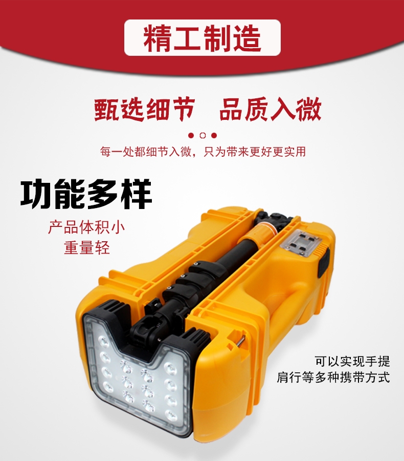 ◆轻便耐用:灯具体积小、重量轻,可以实现手提、背行两种携带方式。灯具也可以安装铁轨轮,方便用户在铁路单轨上移动;