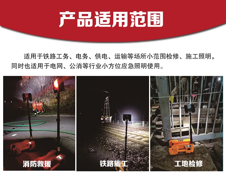 适用于铁路工务、电务、供电、运输等场所小范围检修、施工照明,同事也适用于电网、公消等行业小方位应急照明使用。
