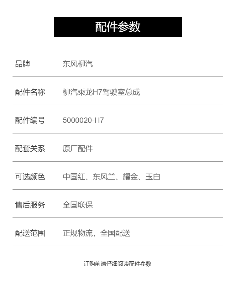 配件名称 | 柳汽乘龙H7驾驶室总成 | ||