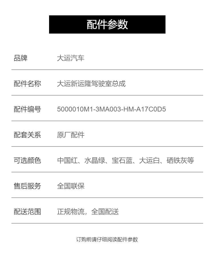 配件名称 | 大运新运隆驾驶室总成 | ||