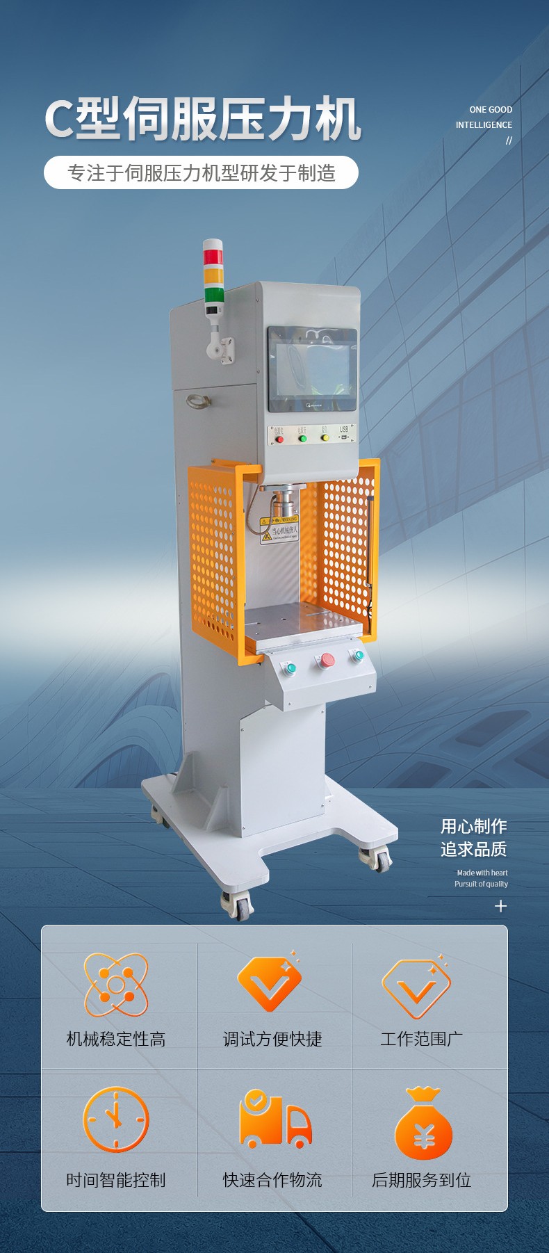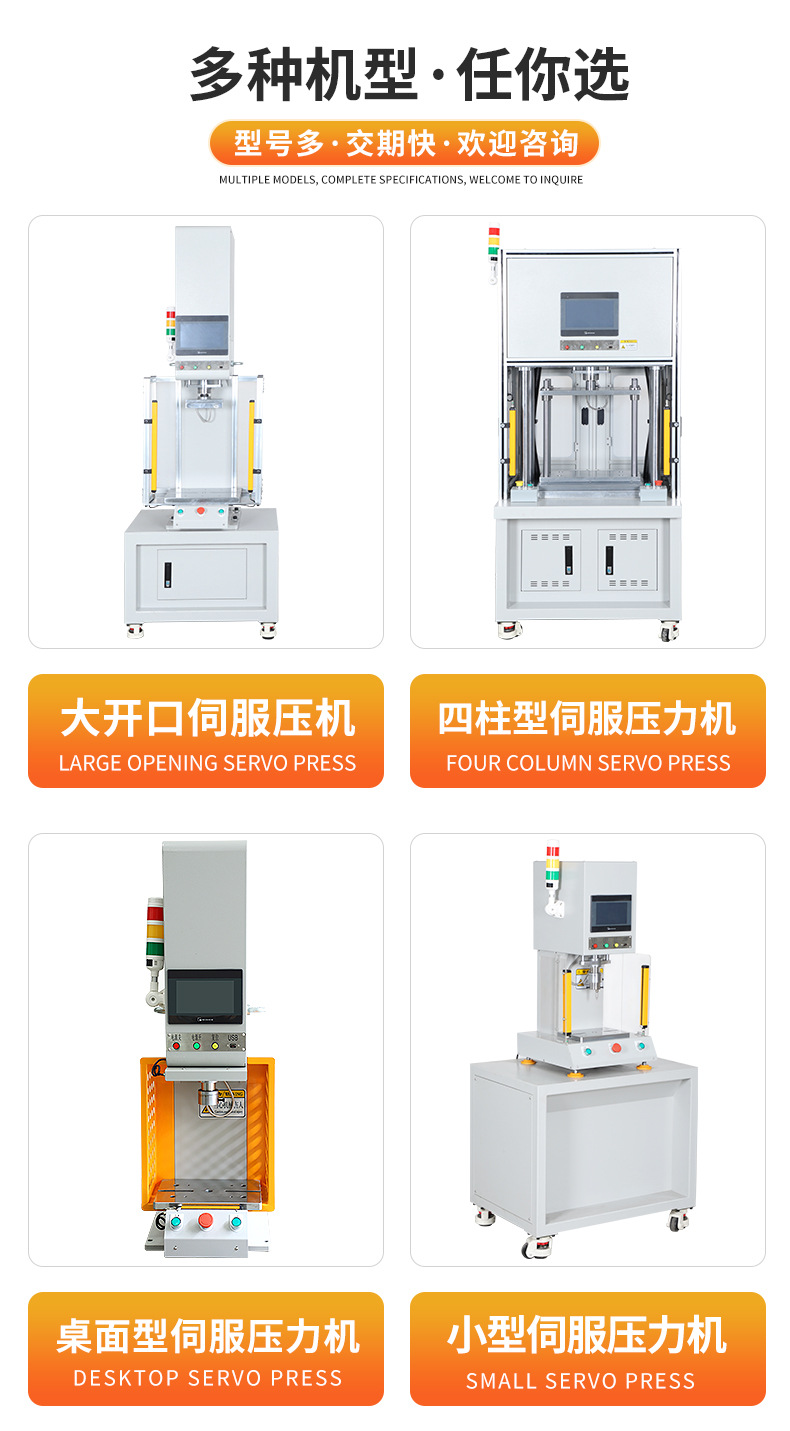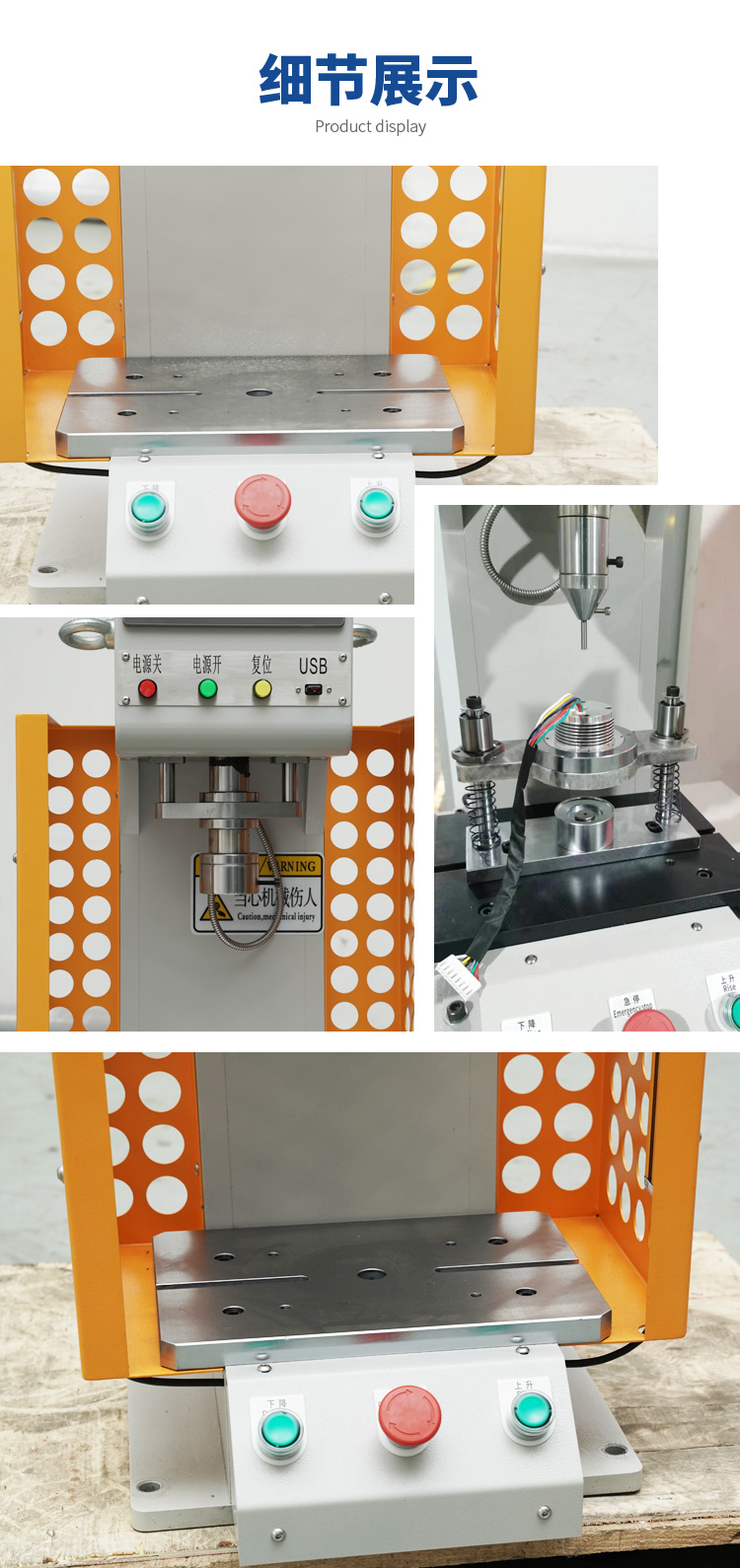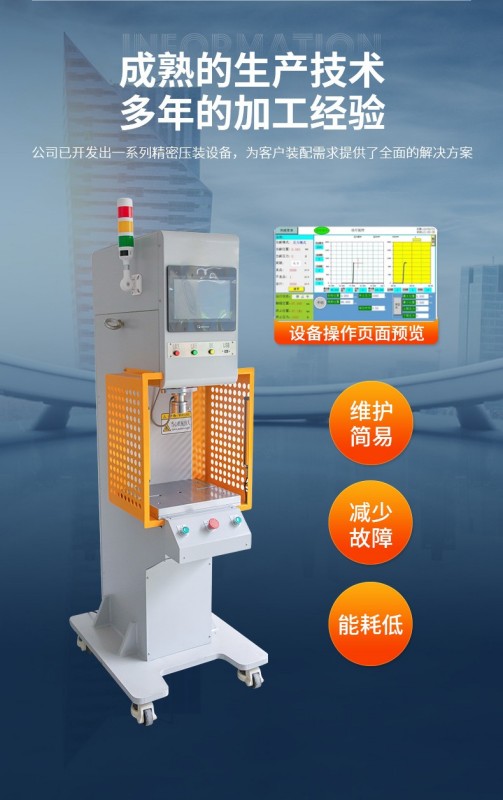 在对产品的压入过程中,实时显示当前压装位置、压装力,并及时准确的判断过盈量是否大小合适,同时显示出整个力与位移的压装曲线,很好的解决了传统压机只能压入不能检测、效率低不能批量生产的弊端;设备整体结构均通过加强设计,刚性远超出一般普通压机标准,采取了整体防尘设计。