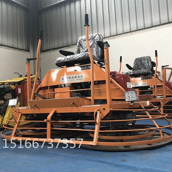 座驾式抹光机主要动力来源是汽油发动机,在机器底部有两个大圆盘,大圆盘中间带有抹刀,通过大马力汽油机的带动使抹刀进行高速旋转,从而带动机器进行混凝土路面的抹平、收光。座驾式抹光机工作时一般先用底盘磨盘进行粗磨,然后在用抹刀进行细磨。座驾式抹光机工作效率是人工的几十倍,非常省劲省力,解放劳动力,降低工作成本,提高工作效率。