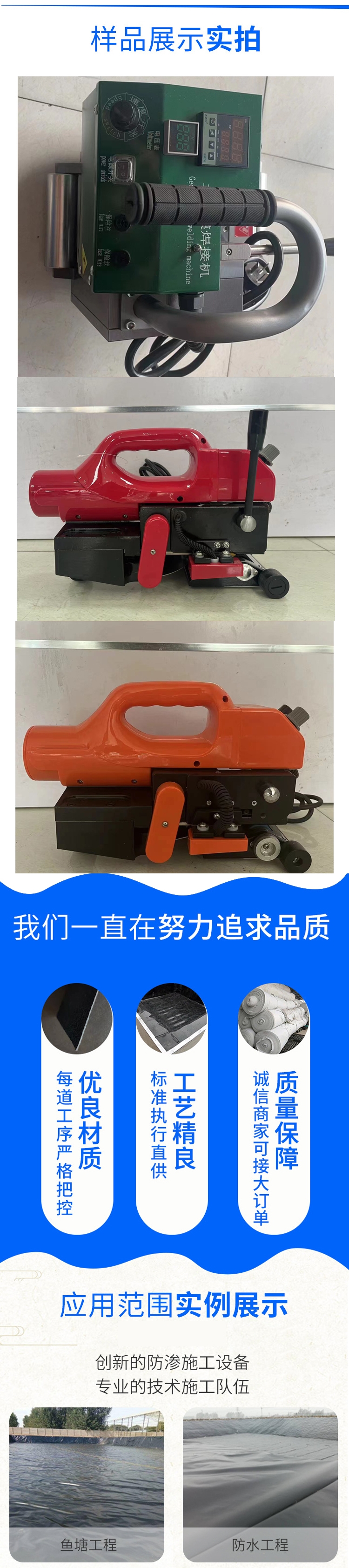 应用领域 | 沼气池、蓄水池、化粪池、人工湖、养鱼池、藕池等HDPE防渗土工膜及复合土工膜的防水焊接 | ||