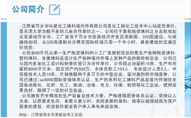 商铺名称:江西省萍乡市环星化工填料塔内件有限公司