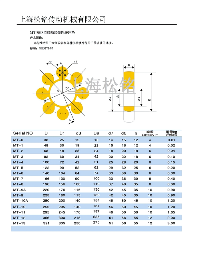 上海松铭传动机械有限公司是一家研究、设计、销售传动类产品的企业,主营产品有:ML梅花弹性联轴器、GR星型弹性联轴器、弹性膜片联轴器(DJM、SJM、JMII、JMIIJ)、弹性柱销套联轴器、十字轴万向联轴器、万向节、鼓型齿联轴器、波纹管联轴器、UL轮胎联轴器、SL十字滑块联轴器,KC链条联轴器、JS蛇型弹簧联轴器、凸缘联轴器产品等,Z型胀紧联结套及锥套皮带轮(SPA、SPB、SPC、SPZ)