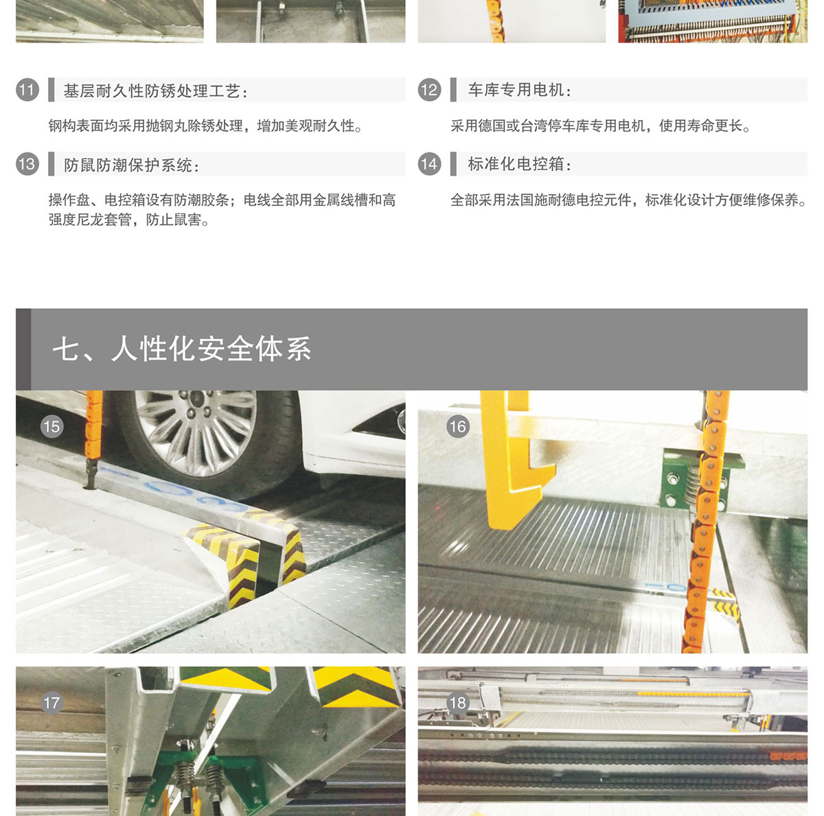 立体停车库有哪些保障安全的防护设置1)轿车开上转盘后,为了轿车停止的位置正确,有机械机构进行纠偏动作,把车辆摆正。2)轿车在转盘停止后,有轿车的三维、超宽检测,车辆的外轮廓线车位空间。3)升降机与转盘对接后,有对准检测,是在对准的情况下才能进行车辆交接。4)升降机有安全防坠装置和安全钩,车辆在升降方向在任何情况下不能下坠。5)升降机的立柱上下两端安装减速、限位检测开关,升降过程不运行范围。6)输送小车的运行方向两侧,安装车门打开检测,输送小车运行过程中,出现车门打开的现象出现。7)输送小车与货位对准有对准检测,在对准的情况下,车辆才能进行存储。8)输送小车运行方向的两端,安装减速、限位开关,运行过程中不运行范围。9)输送小车的正对货位的两端,安装有货位车辆检测开关,在货位内有车辆,不进行入库。10)输送小车的中间位置安装检测是否载有车辆的检测开关,输送小车在载有车辆、进行出入库动作的时候才能接收出入库命令。11)在每一层货位,都安装有货位检测开关,输送小车在运行的过程中,对载有的车辆和货位内的车辆出现干涉进行检测。12)货位的载车板安装有导污槽,车辆漏油、车轮泥水等留下,污染下层车辆。13)货位安装有安防检测系统,车辆出现自燃时,及警或者喷水。14)层移小车上安装有无线头,在出入库过程中,有影像进行和查看。15)系统设计了备用输送小车、备用升降机、备用发电机,车辆能够全天候进行存储。16)一旦设备出现故障,可以手动操作设备把车辆从库内取出。17)立体库区顶上和四周安装防尘罩、周边安装防护栏,在适当位置设置声光指引。18)监控系统中设计了故障报警指示和解决办法,让操作人员能够及时处理故障。