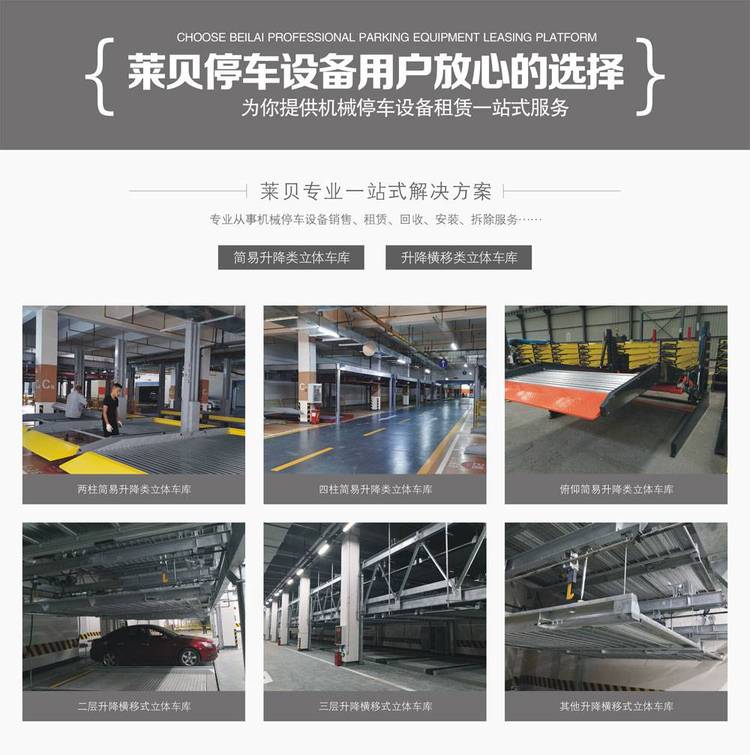 四川莱贝停车设备有限公司致力于云南楚雄州立体车库租、停车位设备、立体车库小区拆除、机械停车设备销售、机械式立体车库设备经营租赁、立体停车场建设、停车场经营管理、停车场规划设计、停车场施工建设、共享停车、盘活停车场、收购停车场、租赁停车场、收购停车位、出售停车位、停车资产管理及互联网停车软件开发车主服务等领域。我们为机场、车站、商场、大学、住宅、酒店、p r停车等各种停车类型,从一个停车场一个区域到一个城市提供停车位经营解决方案。公司严格按照iso9001:2015质量管理体系、iso14001:2015环境管理体系、iso45001:2018职业健康管理体系要求,优化组织架构,规范内控体系,明确部门分工,积极 市场。业务特色鲜明,在市场营销、风险控制、人力资源管理等方面均衡发展,形成覆盖全国的业务网络,建立了科学的管理模式。公司与多家机构、设备制造商、服务团队、停车管理等多家企业形成战略合作关系,抓住历史机遇,在尽可能短的时间内,做大做强做牌。不断设计并优化停车场方案,为客户提供多元化的立体停车场经营以及技术支持服务,致力于成为国内立体停车场经营提供商。为了响应快速发展的停车需求和引入社会资源优化停车产业结构的号召,莱贝停车设备配合政策,解决城市停车难题,将未来停车产业推向新的领域。公司利用人才、技术和设备 ,租赁一系列适合国情的产品。主要有:云南楚雄州立体车库租、停车位设备、立体车库小区拆除、简易升降式、升降横移升降式等。该产品具有占地面积少、空间利用 安装方便、能耗低、噪音小等特点,适用于各种场地和建设要求。公司为客户提供立体车库规划计划、施工设计、安装调试、运营培训、技术支持、机械停车设备销售、租赁、回收等多项服务。
