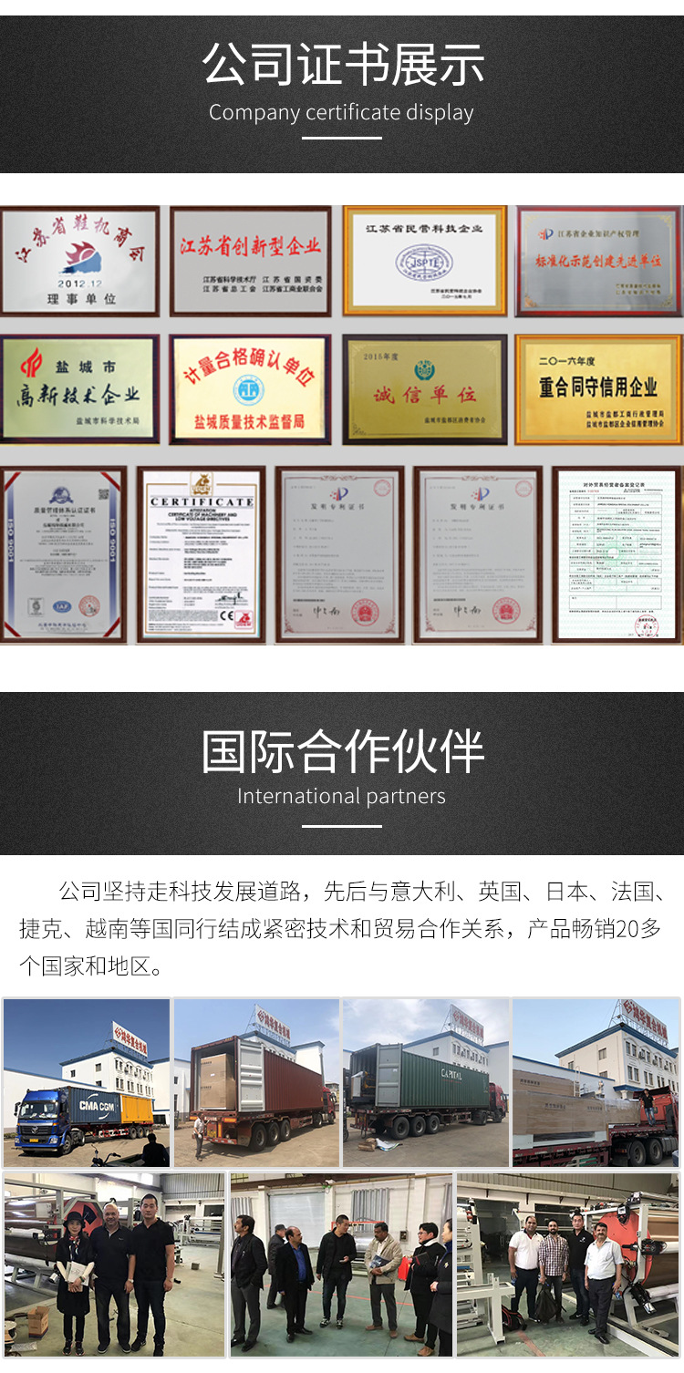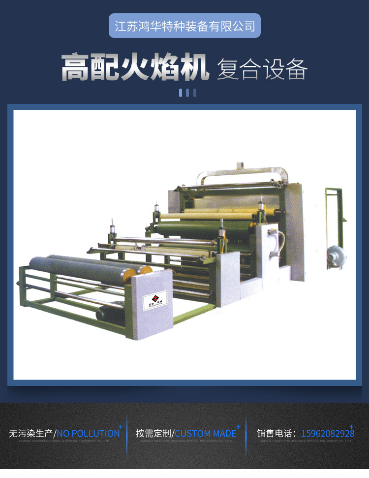 用于海绵与毛绒织品、布类、无纺制品、装饰材料的复合。 特点:采用海绵本体作粘合材料,经过火焰喷射使之熔化与其它材料粘合,亦可将其它两种材料利用海绵燃烧熔化后粘合起来,尤其适合毛绒、虎皮绒的复合,具有整体性强、手感好、耐水洗、干洗等优点。 FLAME LAMINATING MACHINE Usage: used for laminating sponge with nap textiles, cloth, nonwoven products and decorative materials etc. Features: The sponge is adopted as the bonding material. After melted by high temperature ejected by the flame, the sponge is laminated with other materials, or it can be used to bond other two kinds of materials after it is burnt and melt. It is especially applicable to the lamination of nap and tiger fur nap etc., with such advantages as strong integrity, good hand sense, resistance to water cleaning and dry washing etc.