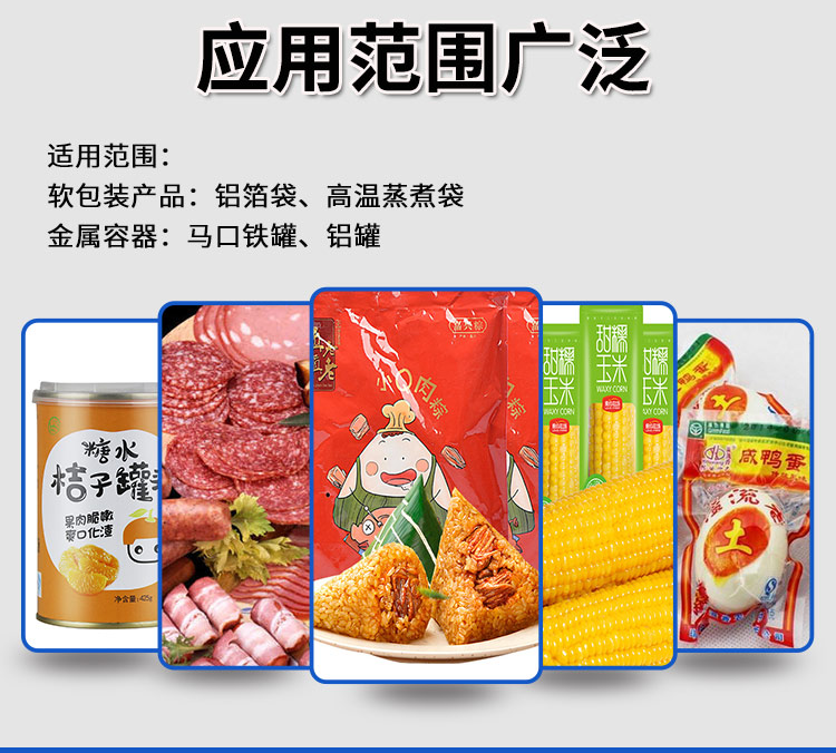 适用范围 | 金属容器 | 马口铁罐、铝罐。 软包装产品 | 铝箔袋、高温蒸煮袋 |