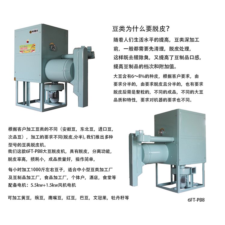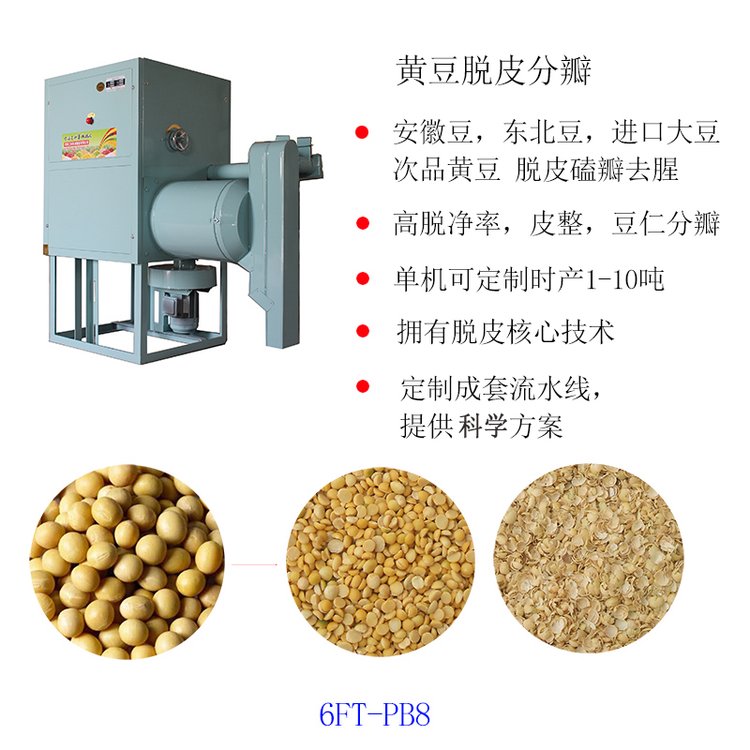 ?本系列大豆脱皮机适用于大豆(黄豆),豌豆等豆类干法脱皮分离,绿豆,扁豆磕瓣等,是黄豆脱皮的佳机。
