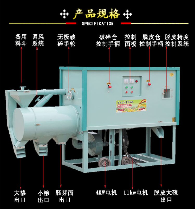 本厂生产的玉米脱皮制糁机,主要部件完全按照国际欧盟标准生产,脱皮破碎部分核心部件都是锰钢合金材质,加大 加厚 加粗,主轴经过反复的淬火调质处理,长时间使用不变形,不弯曲,不打颤,不走内圈,同心率高,经久耐用!这就是为什么机器质量有优劣之分,价格有高低之别。机器外形可类似,可防造,但是核心的技术,经验是无法仿造的。本公司生产的多种型号玉米脱皮制糁机,采用无极破碎制糁技术,颗粒均匀,糁大小可调,色泽光亮。产量可定制。欢迎到厂参观考察,现场试机!