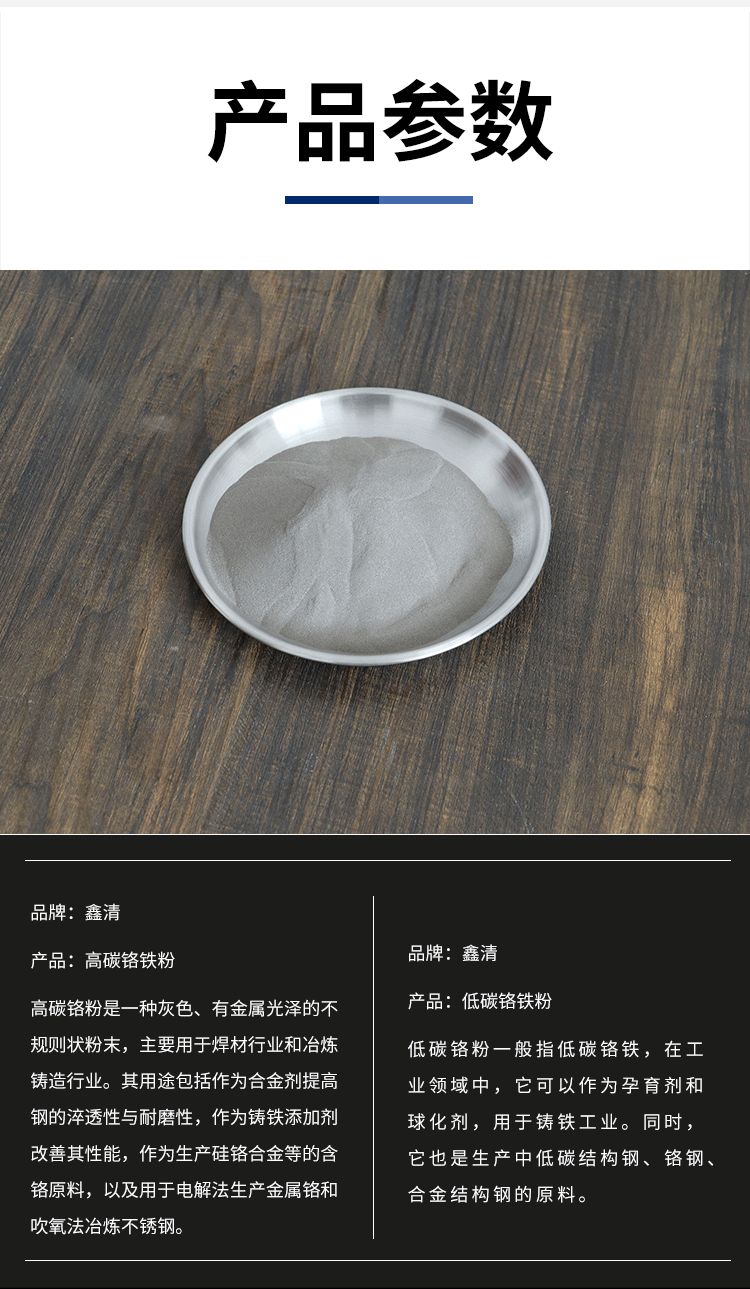• 规格:高碳铬铁粉(含量、粒度区间请备注)