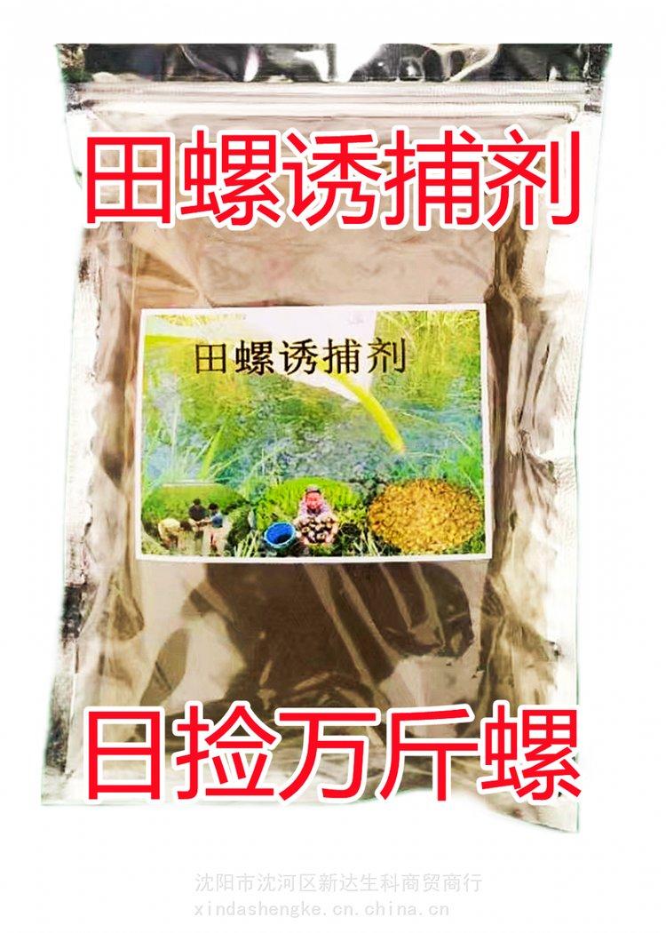 ? ? 田螺诱捕剂,也叫田螺引诱剂河螺石螺诱捕剂。虽然名字不一样,产品都是一样的。它是粉剂的,田螺诱捕剂引诱剂使用时,把田螺诱捕剂放在捕田螺笼里,田螺引诱剂就能把周围一百米内的螺类引诱到田螺笼里。田螺诱捕剂引诱剂使用方法简单。一次一般用10克,就能放一个笼子,一个大点的水蛭笼就能搞几十斤的。田螺诱捕剂引诱剂的使用方法:(1)取田螺诱捕剂引诱剂一包,倒出来十克,倒在容器内。加适量的水,搅拌均匀,做成像 汤圆大小的一块。然后用蚊帐布包起来,挂在田螺笼内。(2)把挂好田螺诱捕剂引诱剂的笼子,下到有田螺的水中。(螺类一般都是 喜欢晚上觅食,所以要在天黑之前下好笼子)(3)过次日早晨就可以收获了!