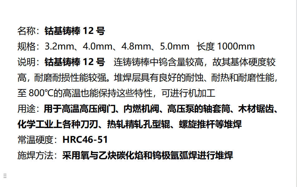适用范围 | 如汽车、内燃机气门、高温高压阀门、热剪切刀刃、热锻模等同时经受冲击和高温场合以及轴承的内、外环、高温高压阀门、内燃机阀、高压泵的轴套筒、木材锯齿、化学工业上各种刀刃、热轧精轧孔型辊、螺旋推杆等堆焊 | ||