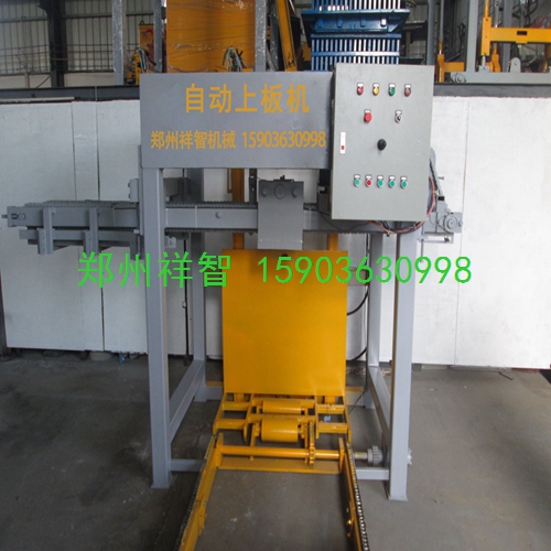 自动上板机是混凝土砌块成型机的辅助设备,自动上板机代替人工完成上板。由于大中型砌块成型机每块托板的重量已达几十公斤,人工上板劳动强度很大,且人工费用较高,它是无需专人看管,无噪音,无震动,放置在硬化的地面,即于送板机配套使用。方便经济实用,从而降低生产成本,提高了工作效率。是全国各地免烧砖厂家不可缺少的砖机标准化套设备。