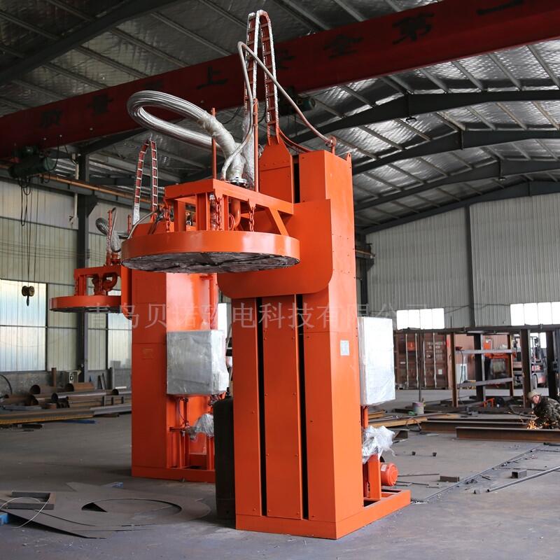 立式升降式烘包器是对等待出铁的铁水包进行快速加热、升温的烘烤装置。本装置采用立式结构,直立于地面,设备占用现场面积小、适用范围广。铁水包盖垂直升降启闭。升降小车可垂直升降,从而带动大臂及包盖升降,燃烧介质沿立柱侧面向上引至大臂,经大臂至安装在包盖中心的燃烧器进行燃烧。助燃空气由高压风机提供,直至安装在包盖中心的燃烧器进行助燃。烤包设备支架是烘烤装置的支撑,其承受包盖、大臂及驱动装置,带动铁包盖垂直升降。采用电动卷扬机和滑轮组。