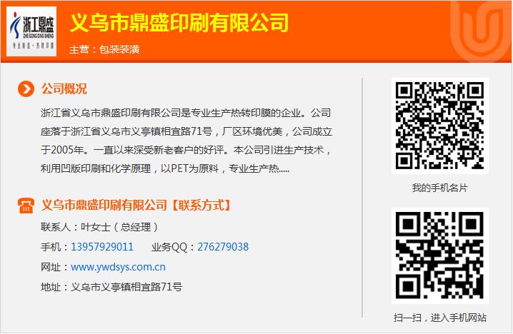 义乌市鼎盛印刷有限公司,在未来将有更多样创新的转印材料陆续推进市场,我们坚持优质诚信,更期待能为您提供称心满意的服务。