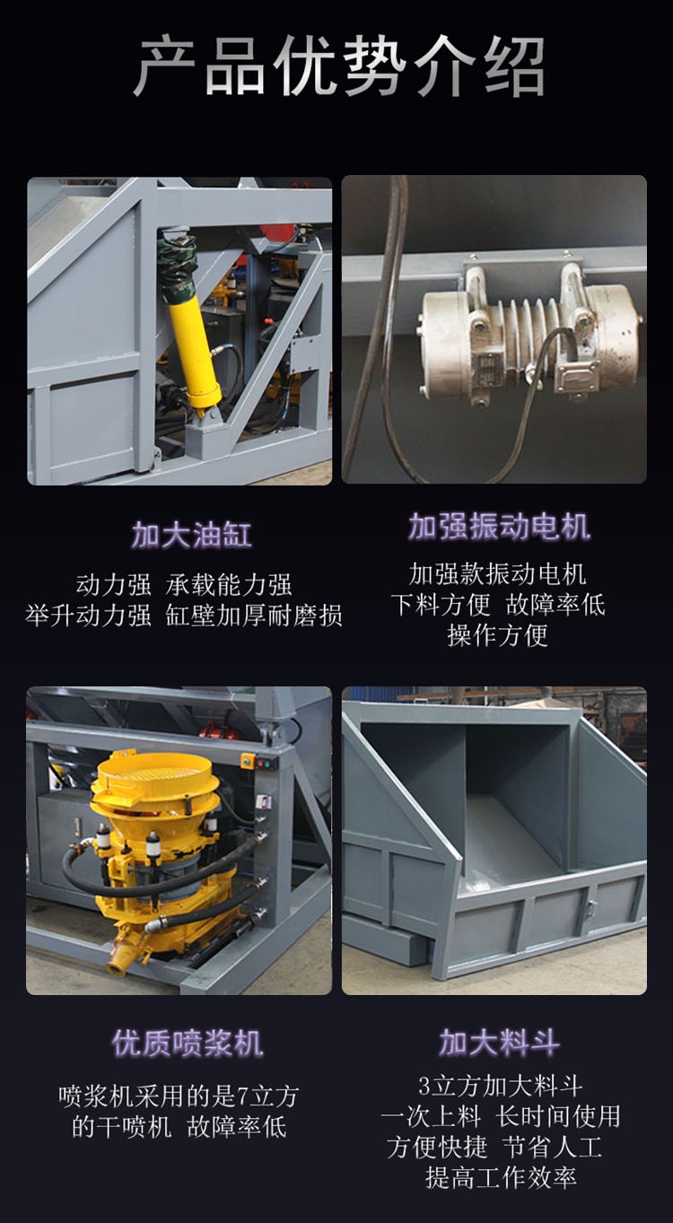 行走式喷浆机组自动化上料喷浆机组这台自动上料喷浆车是升级版本,配有断气刹,和大功率发动机,主要是因为前面有用户反应我们的喷浆车在工地上爬坡没劲,而且进入施工点时,行走式喷浆机组必须经过的坡道上,也不是很安全,容易熄火,这次改进了这些问题。豫龙牌吊装式自动上料喷浆机组设备介绍。