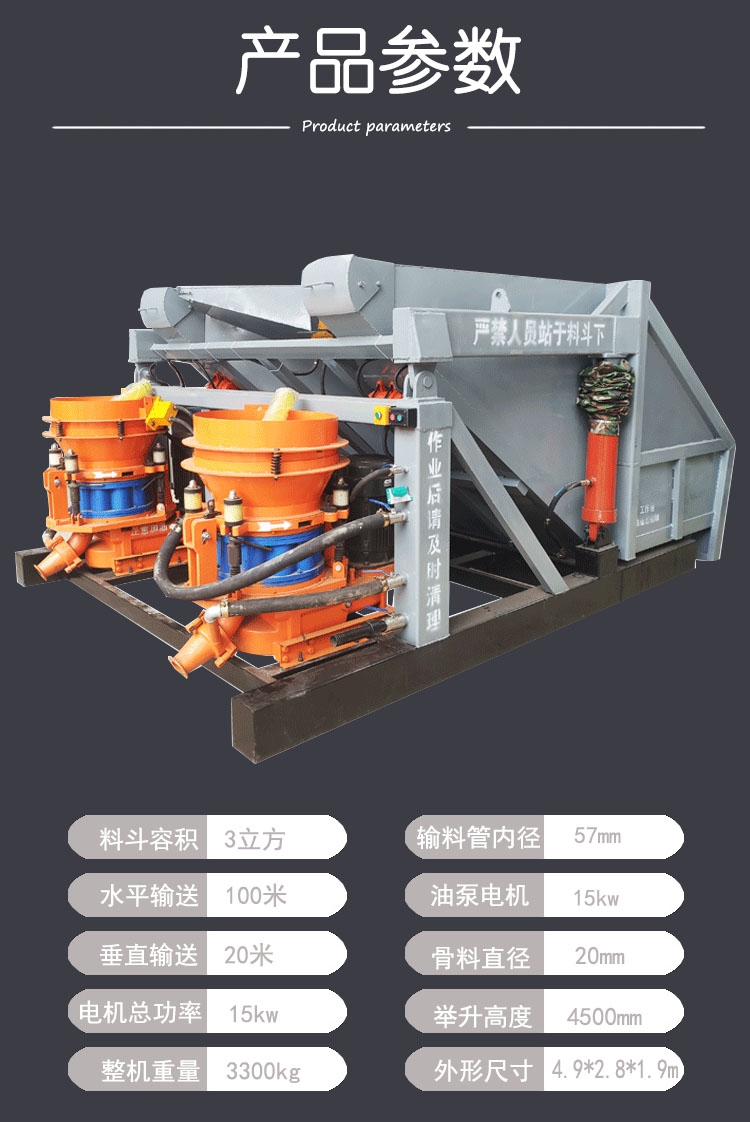 在转子的每个料腔内有一个活塞、转子活塞与凸轮组成联动机构、在转子的转动过程中,通过凸轮、活塞杆、转子联动机构迫使活塞在料腔内上下移动、完成下料和喂料。混凝土料由活塞强制推送喂入气料混合仓、与压缩空气混合后形成稀薄流形态、通过管道输送到喷嘴喷出,这种机内泵送和管道稀薄流输送相结合的混凝士输送方式、在一定程度上综合了泵送型和风送型湿喷机的优点。使用湿喷机进行喷射混凝土作业,可以大幅度降低粉尘浓度和回弹率,增大一次喷层厚度,提高生产效率,保证工程质量。隧道吊装自动上料喷浆机吊装式喷浆机组
