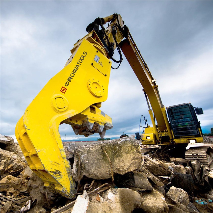 液压粉碎钳由钳体、液压油缸、可动颚和固定颚组成,外部液压系统为液压油缸提供油压,使液压粉碎钳的可动颚和固定颚一张一合,达到粉碎物体的效果。