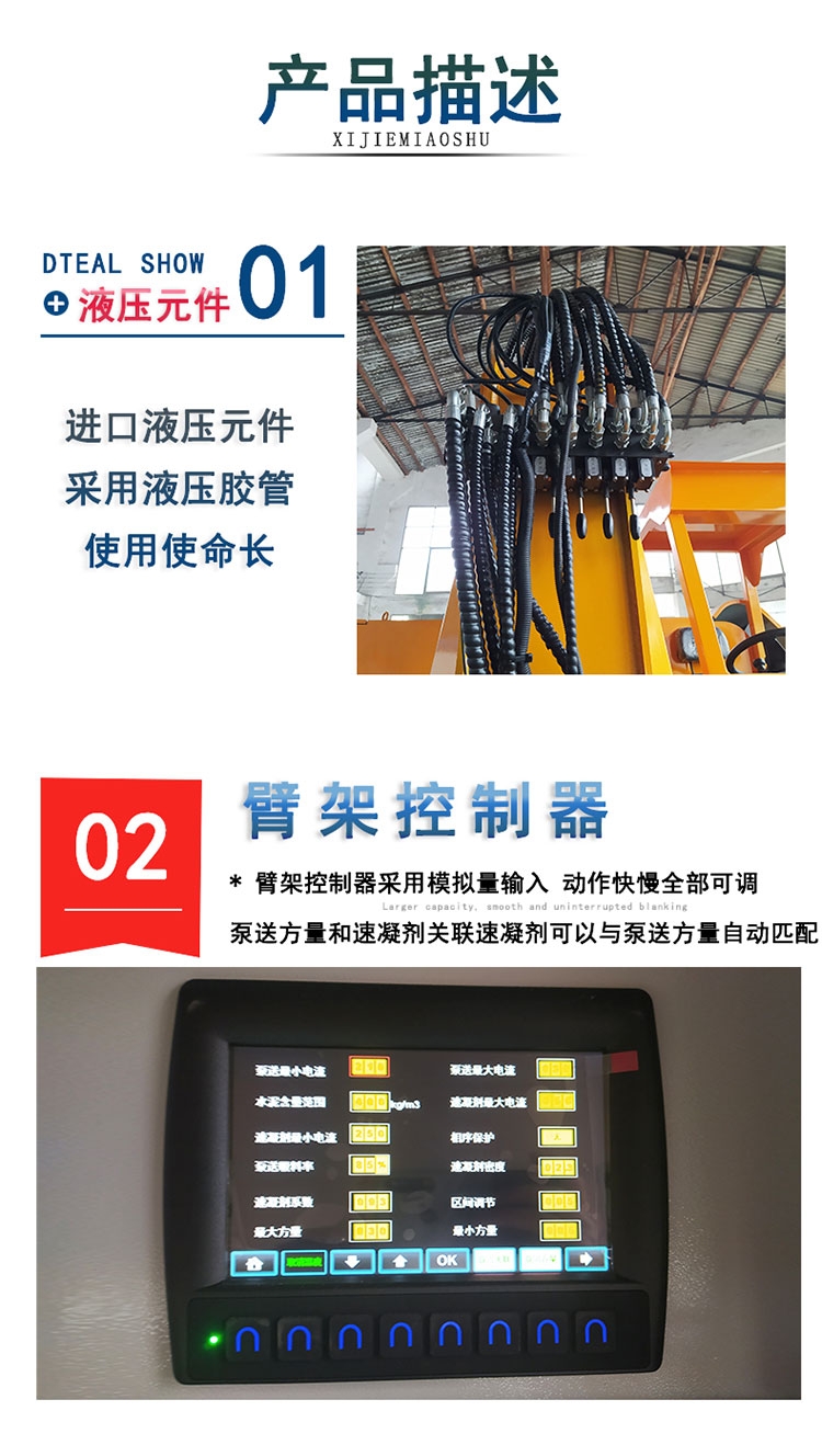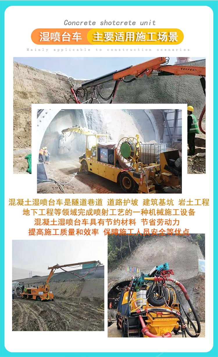 举例说明:本工程采用式混凝土机械手进行作业,没有较为熟练的班组,我们只有采用自我摸索培训的在作业 中不断。在机械手喷混凝土作业中,操作手至关重要,操作手的技术水平、、责任心在混凝土回弹及速度乃至设备 使用中起到决定性作用。一般来说,一个较为熟练的手至少要2个月以上时间,同时还要看操作手悟性和技能动手能力的高 低。 工程混凝土湿喷车 基坑加固喷浆机械手 湿喷台车工程混凝土湿喷车 基坑加固喷浆机械手 湿喷台车。