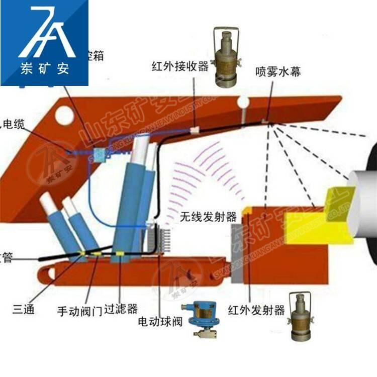 ZCYS127-Z矿用隔爆兼本安型采煤机尘源跟踪洒水降尘装置:根据采煤工作面的长度或用户要求,在工作面将一定数量主控箱及配接设备安装在液压支架适当位置并用电缆及管路连接成系统,在工作面端头放置一台主机,根据现场情况,在主机上设置一体化电磁发数量、喷雾延时、电磁阀打开数、通讯方式等,主控箱采用高分辨率液晶屏显示,显示直观,操作方便。在主控箱上设置好参数后,会自动将数据信息下发给所有一体化电磁阀。主控箱与一体化电磁阀之间可采用无线通讯方式,可降,同时也大大减少了安装与维护工作量。