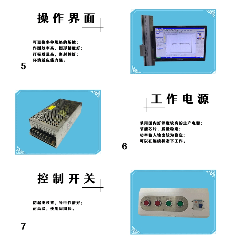 4、电脑主机系统跟打标系统分开,打标方便,设备各部件严格按照中国ISO9001质量标准。