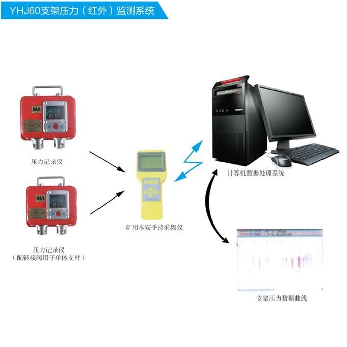 矿用本安型单体液压支柱压力自动检测仪是用于煤矿中液压支柱的压力参数的监测的智能化仪表,它具有自动记录,远红外数据采集,计算机管理和自动报警等功能,而且重量轻、操作方便、显示直观、输出报表具有通用性、数据功能强。通过改进的电源供电系统,大大地提高了仪器的使用可靠性和电源使用寿命,可长期在井下使用无需维护。并具有汉显功能,是非常理想的而且是非常先进的压力自动记录仪器。