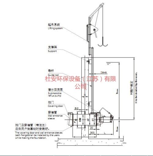 潜水回流泵安装系统主要由手拉葫芦、起吊架、吊架座、起吊环链、导杆、穿墙管、拍门等组成。
